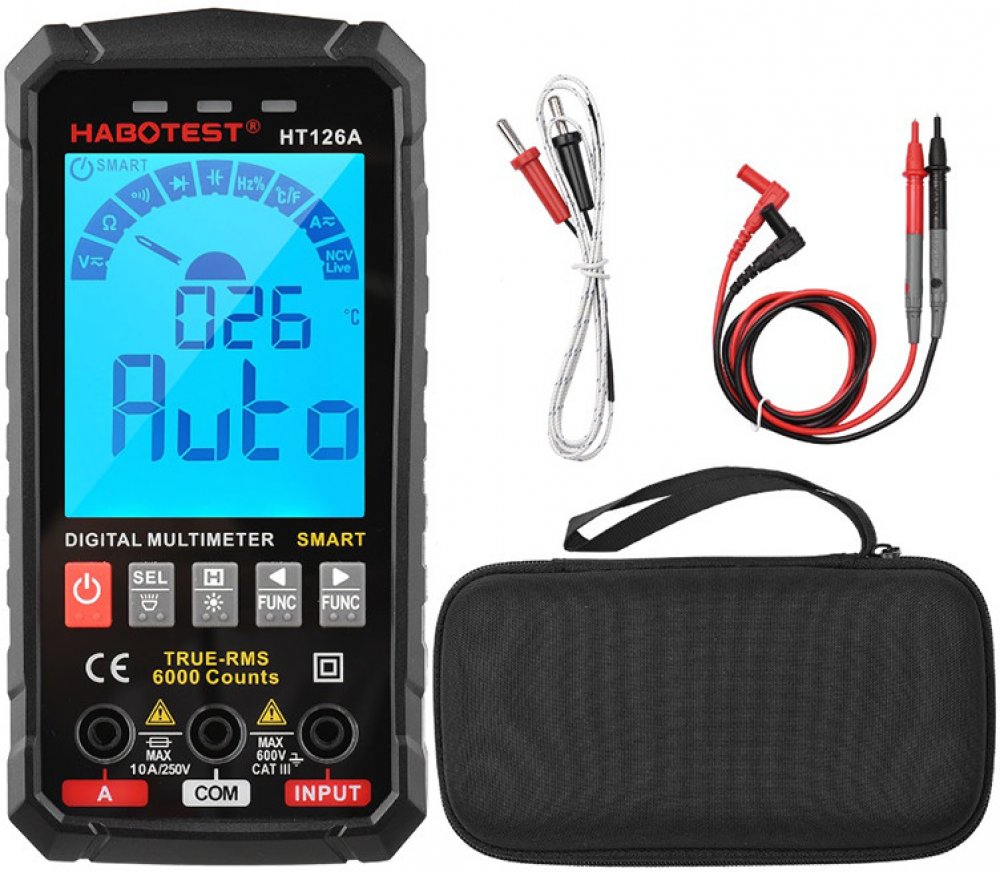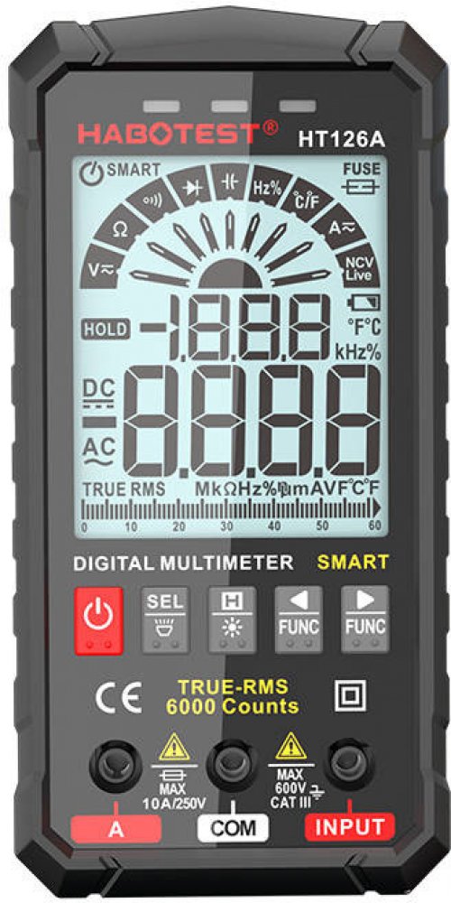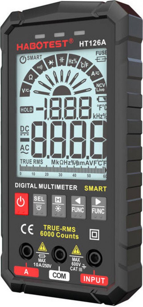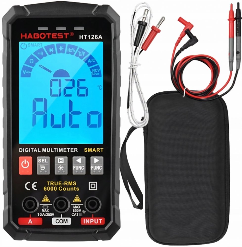 Habotest HT126A je chytrý a odolný multimetr navržený pro přesné měření i v náročných podmínkách, včetně venkovního prostředí. Tento praktický přístroj nabízí široké spektrum funkcí, jako je měření napětí, proudu, odporu, kapacity, frekvence a dalších parametrů. Díky velkému TN displeji, silikonovým tlačítkům a vestavěné LED svítilně je práce s ním snadná a pohodlná. Navíc díky kompaktním rozměrům a nízké hmotnosti je ideální pro každodenní použití i snadné přenášení. Přístroj je napájen čtyřmi AAA bateriemi (nejsou součástí balení).
