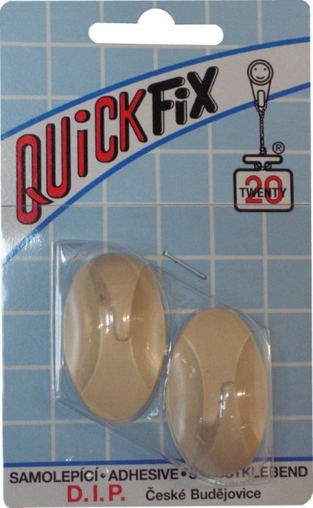 QUICKFIX háček samolepicí typ 2 - 2ks - slonová kostSamolepící háčky QUICKFIX jsou vyrobeny z kvalitní plastické hmoty, zaručující dobrou pevnost vzhled a především perfektní přilnavost ke speciální podlepce z oboustranné lepící pásky. Tato páska svým pěnovým materiálem zajišťuje vyrovnání mírných nerovností povrchu a dobré přilepení celé plochy háčku.Použití - háčky jsou určeny především pro zavěšení lehkých předmětů - ručníků, utěrek atd. na stěny z hladkých materiálů. Široká barevná řada, která je průběžně zdokonalována podle požadavků zákazníků a módních trendů, umožňuje barevné sladění prakticky s jakýmkoli odstínem podkladu.POZOR - před přilepením háčků je nutno dobře odmastit podkladovou plochu nejlépe lihem !