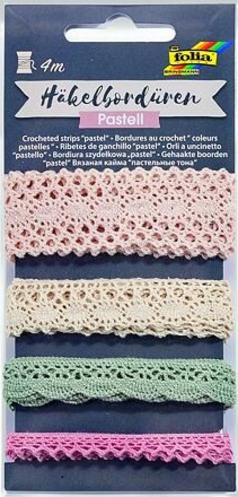 Háčkované bordury Krásná sada háčkovaných bordur v přírodních nebo pastelových barvách. Bordury působí romantickým a elegantním dojmem. Bordury jsou skvělé k dekorativním a kreativním účelům. Krásné vzory, krásné barvy a dokonalé provedení. Můžete vytvářet krásné dekorace na jaro i Velikonoce, pozvánky, přáníčka a mnoho dalšího. Sada obsahuje 4 druhy bordur a každá bordura je dlouhá 1 metr. Balení...