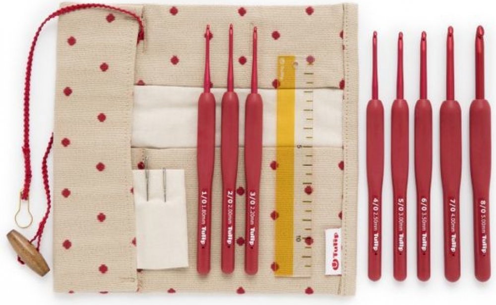 Kvalitní japonský háček Tulip Etimo Red má hladkou a dobře zaoblenou hlavičku s dokonalým tvarem, který padne do ruky. Matný červený háček neodráží světlo a vyniká při háčkování na pozadí tmavých barev. Výrobce se postaral o vysoký komfort používání Tulip Etimo Red, rukojeť pokryl potahem příjemným do ruky. Háček je jemný, rukojeť lze snadno poškrábat, ale nijak to neovlivňuje pohodlí při používání. Uvedena cena za 1 sadu. Tato sada obsahuje: Háčky