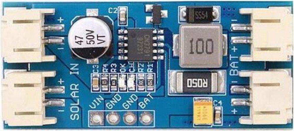 Solární regulátor MPPT pro jednočlánkové baterie Li-Pol a solární panely s pracovním napětím 6V. Technické parametry: - vstupní napětí: 5–8 V (určeno pro FV panel se systémovým napětím 6V) - výstupní napětí: 4,2 V pro nabíjení Li-Pol nebo Li-Ion článku 3,7V - nabíjecí proud: max. 2 A - možno připojit 1–2 FV panely - 4× konektor JST, včetně kabelů - spínací frekvence: 300 kHz - indikace stavu nabíj...