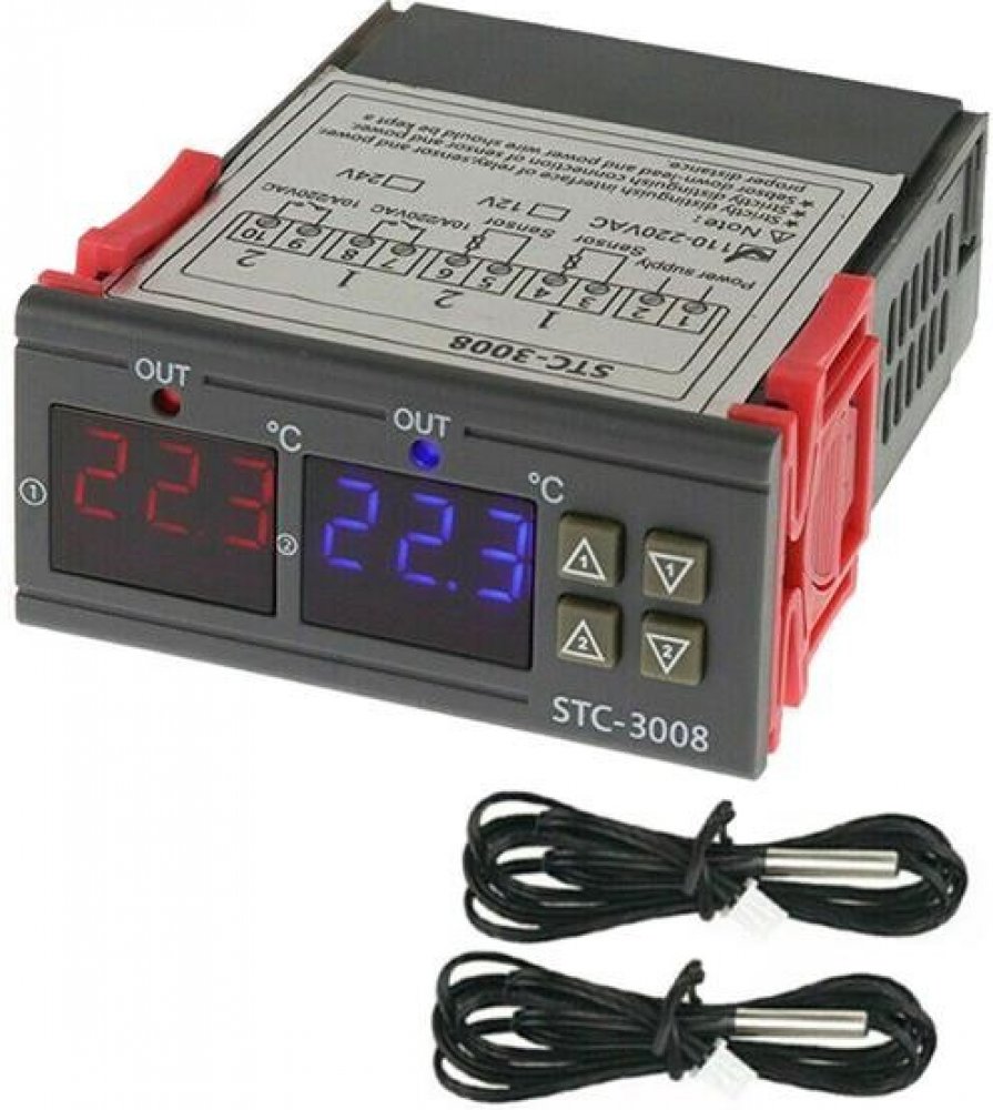 Digitální termostat duální - STC-3008 rozsah -55°C~120°C, 230V AC. Termostat umožňuje nastavení teplot T1 a T2 pro dva nezávislé okruhy, tzn. 2× T1 a T2, kde T1 je teplota, při které termostat sepne a T2 je teplota, při které termostat vypne. Sepnutí termostatu indikují LED diody OUT1 a OUT2.Parametry produktu:- duální termostat se dvěmi externími teplotními sondami i výstupními relé- dva nezávislé regulátory teploty v jednom zařízení- umožňuje regulovat teplotu v rozmezí –55°C ~ 120°C s rozlišením 0.1°C- duální displej, červený a modrý displej zobrazující obě teploty- dvě relé a dvě sondyTechnické parametry: - napájení: 230VAC- příkon: 3W- nastavitelná teplota: –55°C ~ 120°C- do 99,9°C s rozlišením 0.1°C, 100–120°C s rozlišením 1°C- přesnost měření teploty: ±1%- teplotní čidla: odporové NTC, 10kohm, 0.5%, přívody 1m, vodotěsné- spínací kontakty relé: 230VAC 10A (odporová zátěž)- pracovní teplota: 0 ~ 60°C- rozměry: 75×34.5×85mm- montážní otvor: 71×29mm- hmotnost: 138gNávod k použití:Pro nastavení teploty T1 dlouze podržte ^1 nebo ^2 v závislosti na nastavení požadovaného okruhu 1 nebo 2. Jakmiledisplej začne blikat, šipkami lze upravit nastavení spínací teploty (přednastaveno 25°C). Pro nastavení teploty T2 dlouze podržte ˇ1 neboˇ2. Jakmile displej začne blikat, šipkami lze upravit nastavení vypínací teploty (přednastaveno 40°C).Současným stiskem ^1 a ^2 v režimu nastavení lze dále upravit čas zpoždění zapnutí okruhu 1 (P0 na displeji) nebo okruhu 2 (P1na displeji) v intervalu 0–60min.(přednastaveno 0min) a zvukový alarm vysoké teploty (P2) nebo nízké teploty (P3). Zvukový alarm vysoké a nízké teploty je továrně nastaven na mezní hodnoty termostatu, tzn. –55°C/ +120°C. Současným stiskem ^1 a ^2 na 3sec. se obnoví tovární parametry.Napájecí napětí připojte na červený(+) a černý(-) vodič, 12V spotřebiče na žluté a černé vodiče.Pracovní režimy:- oba okruhy lze nastavit rovněž inverzně, kdy je T1 > T2. Tím lze kombinací obou okruhů získat mnoho způsobů regulace, např. v určitém rozmezí teplot zapínat topení a v jiném rozsahu teplot zapínat chlazení.- režim topení (T1 < T2): Po zapnutí zařízení je výstup termostatu sepnutý, dokud měřená teplota nedosáhne úrovně T2. Jakmile měřená klesne na úroveň T1, výstup se znovu aktivuje.- režim chlazení (T1 > T2): Po zapnutí zařízení je výstup neaktivní, dokud měřená teplota nedosáhne úrovně T1. Poté se výstup aktivuje do doby, než naměřená teplota dosáhne úrovně T2.Výrobek není samostatně funkční celek, vyžaduje odbornou montáž.