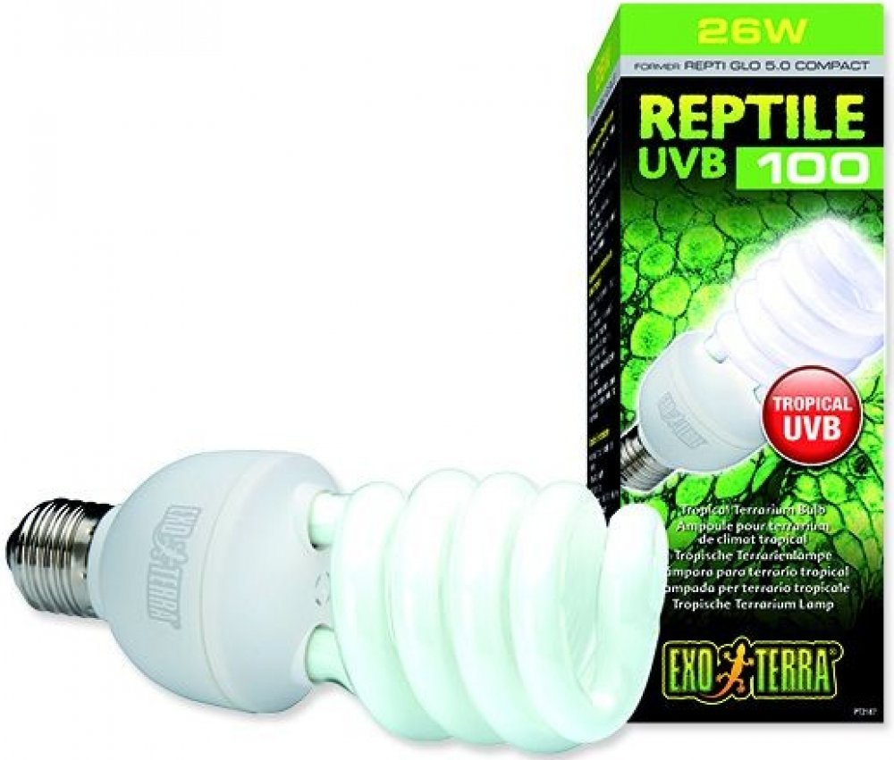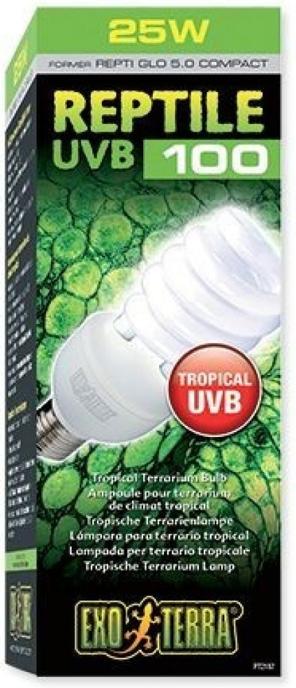 Žárovka Exo Terra Reptile UVB100 vydává optimální úrovně UVB, podobně jako ve stinných prostředích deštných pralesů a dalších tropických lokalitách. Plazi žijící v těchto stanovištích obdrží mírné UV záření v důsledku klimatických podmínek (poměrně vysoká vlhkost, změny počasí, atd.).
