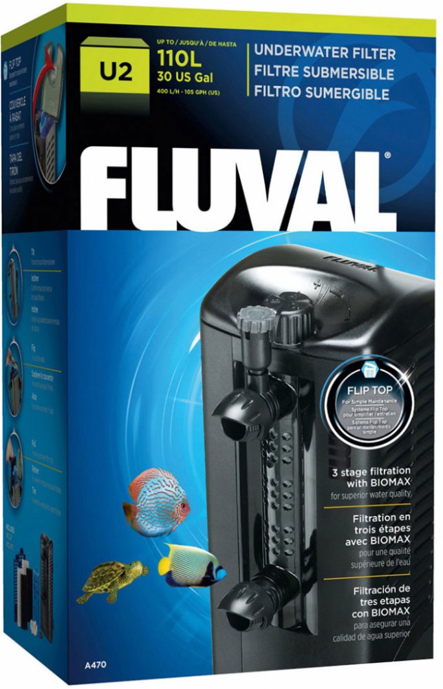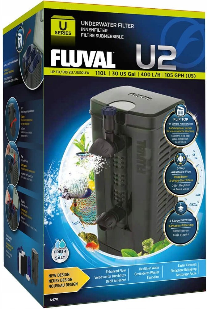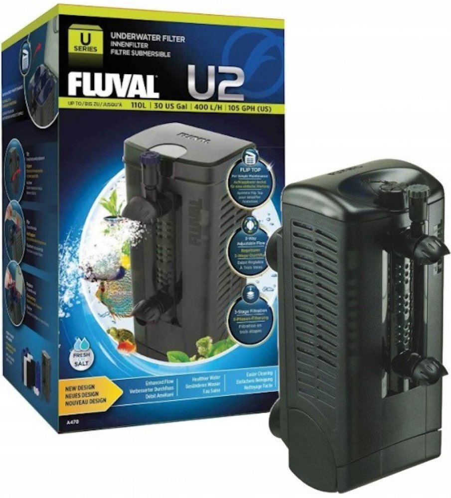 Vnitřní filtr pro akvária o objemu 45 - 110 litrů. Lze ho použít v akváriích se sladkou i mořskou vodou a v akvateráriích. Jedna z výhod filtru je v instalační všestranosti, pomocí přísavek může být instalován vertikálně nebo v mělkých nádrží vodorovně. Filtr má nastavitelné řízení toku a je dodáván s jedním molitanem. Filtr poskytuje kompletní a účinnou 3-stupňovou filtraci, včetně Biomax biologické filtrace, pomáhajá udržet čistou vodu ve vašem akváriu. Filtr poskytuje možnost nastavení výstupu vody ve 3 různých polohách (takzvaná 3-Way Flow Control Funkce). Maximální cirkulace vody a jejího okysličení dosáhnete nastavením na horní výstup, vestavěný Sprey Bar poskytuje jemný, rovnoměrný tok pro osázené nádrže, ve kterých je nežádoucí silný proud a dolní výstup je ideální pro promíchání vody v hloubce akvária. Filtr je dodáván s filtračnímy médii -2 pěnové podložky, 2 Poly / Carbon vložky, a Biomax biologické kroužky. Výkon 400l/h