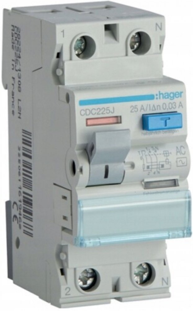 DIFERENCIÁLNÍ VYPÍNAČ 25A 2P 30MA AC HAGER CDC225J (JEDNOFÁZOVÝ)