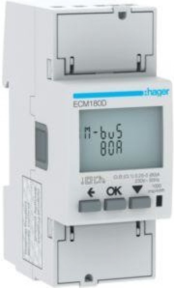 Digitální elektroměr pro inteligentní měření energie od společnosti Hager. Nová generace elektroměrů Hager je vybavena běžnými komunikačními rozhraními, která zaznamenávají veškerou spotřebu a v případě potřeby tyto informace předávají. Digitální elektroměry Hager nabízí řešení šitá na míru pro každou aplikaci – s volitelným měřením impulzů, s rozhraním M-Bus nebo s rozhraním Modbus a v případě potřeby také s přepínáním tarifů. Což je ideální pro inteligentní monitorování energie v obytných a komerčních budovách.  Technické parametry: Počet pólů: 2 P Typ pólu: 1P+N Typ upevnění: na DIN lištu (horní lištu) Třída přesnosti: B Frekvence: 50 Hz Druh napájecího napětí: AC Provozní napětí AC: 92/276 V Maximální provozní napětí: 300 V Jmenovité impulzní výdržné napětí: 6 kV Záběrový proud: 0,015 A Provozní proud: 0,015/80 A Maximální proud (I max) měřicího obvodu: 80 A Příkon: 2 VA Celkový ztrátový výkon při jmenovitém proudu: 1 W Měřicí rozsah frekvence: od 45 do 65 Hz Druh měřicího přístroje: elektronicky Napájecí napětí: 230V ± 20% Utahovací moment: 2 Nm Druh montáže: DIN lišta Průřez vedení vstupní vedení počitadla: 33 mm² Průřez vedení výstupní vedení počitadla: 33 mm² Nastavitelný převod měniče: ne Provedení ovládacího panelu: Externa Provedení elektroměru: počítadlo jedné fáze Normy: EN 50470-1/3, IEC 62053-21/23, IEC 61557-12 Evropská direktiva WEEE: dotčeno Třída izolace: třída izolace II Krytí IP: IP20 Stupeň znečištění podle IEC 60664 / IEC 60947-2: 2 Provozní teplota: od -25 °C do 55 °C Výška n.m.: 2000 m Skladovací teplota: od -25 °C do 70 °C Rozměry: Hloubka: 60 mm Výška: 92 mm Šířka: 36 mm