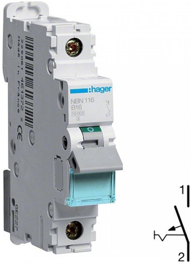 Jednopólový jistič HAGER NBN116 na DIN lištu s charakteristikou zátěže B, maximálním proudem 16 A a zkratovou vypínací schopností 10 kA. Jistič slouží k ochraně elektrických obvodů proti přetížení a zkratu.