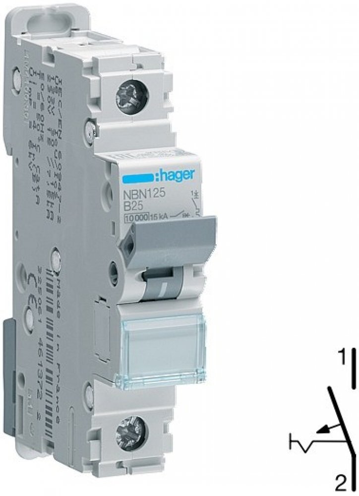 Jednopólový jistič HAGER NBN125 na DIN lištu s charakteristikou zátěže B, maximálním proudem 25 A a zkratovou vypínací schopností 10 kA. Jistič slouží k ochraně elektrických obvodů proti přetížení a zkratu.