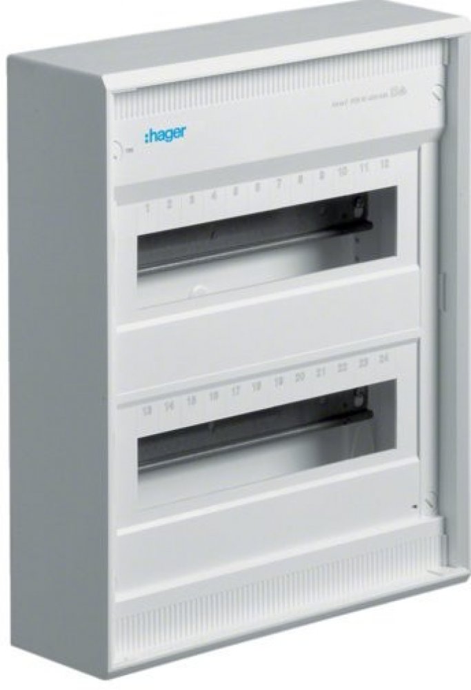 VA24B - Rozvodnice nástěnnáPro přístroje s vestavnou hloubkou do 70 mm je sestavena z:nosného dílu osazeného lištami DIN, v jehož zadní stěně jsou předraženy otvory pro přívodní kabelykrytu z nárazuvzdorného plastu umožňujícího montáž dveří zprava nebo zlevaPE/N svorkovnice s ochranou proti dotyku a jednoduchým zaklapovacím systémemnulové svorky pro obvod proudového chrániče (u 2, 3 a 4 řadých roz...
