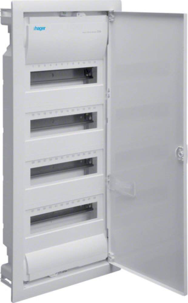 oceloplechové dveře, montáž zapuštěná, krytí IP 30, materiál plast, kov, třída ochrany II, mechanická odolnost IK 07, 12 modulů v řadě, řady 4, moduly 48+8, šířka 335 mm, výška 740 mm, hloubka 90 mm