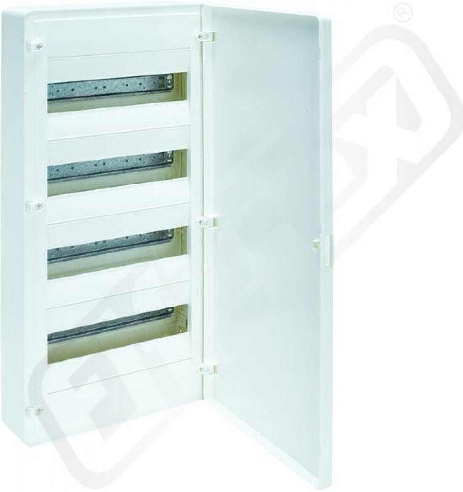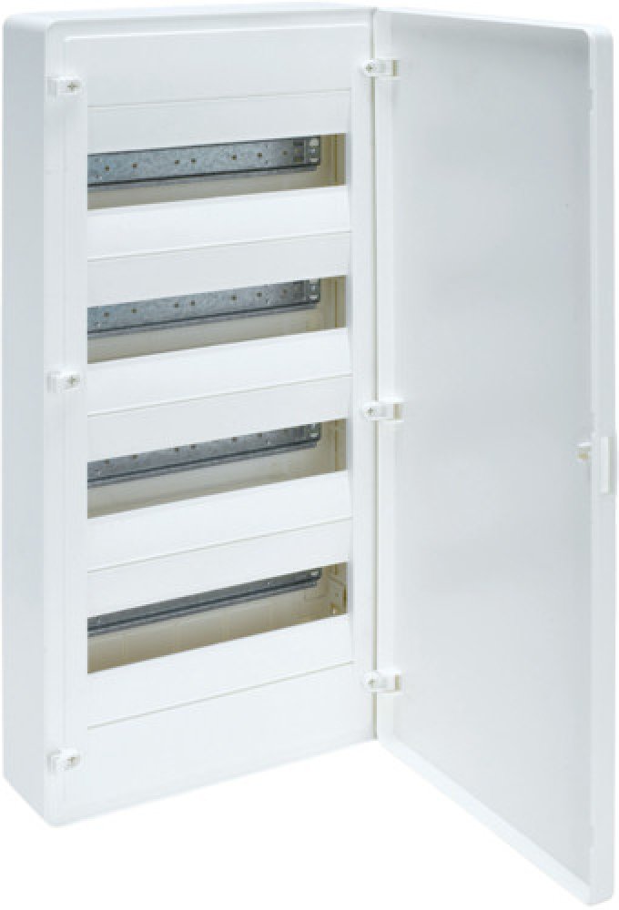 Rozvodnice Golf nástěnná,48M, 4 řadá, plná dvířka Rozvodnice pro nástěnnou montáž VS412PD pro přístroje hloubky 70 mm. Dveře umožňují pravou nebo levou montáž. Změna směru otevírání bez nutnosti demontovat kryt. Dveře se otvírají o 180°. Vstup do rozvodnice může být jednotlivými kabely, nebo lištou.