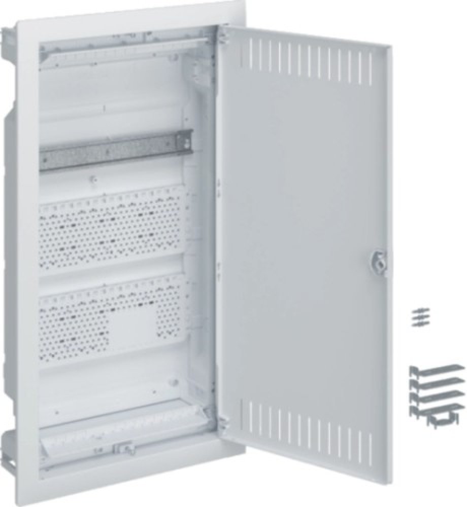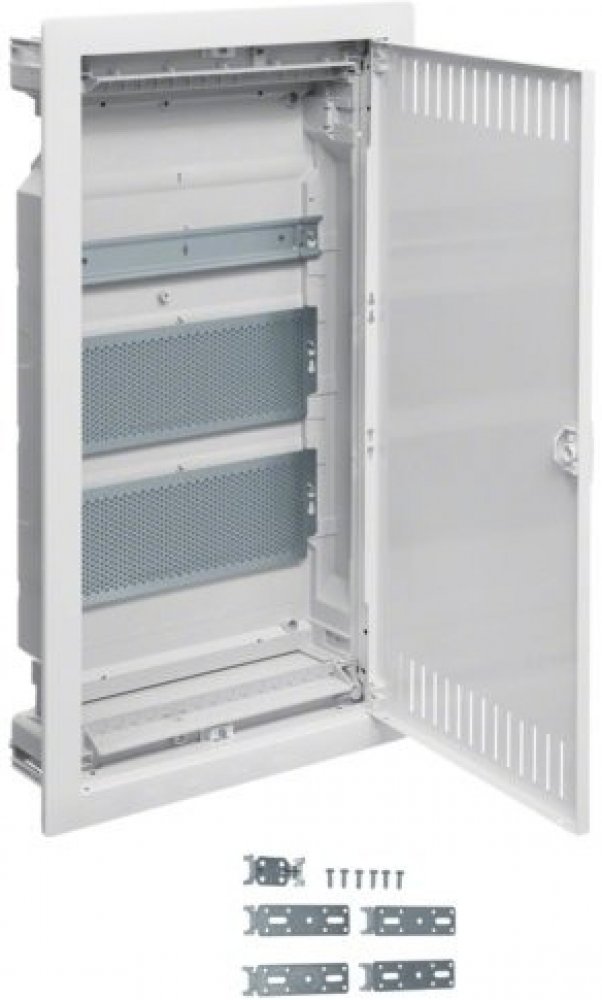 Rozvodnice multimediální zapuštěná, Volta 36, s MPMultimediální rozvodnice Pro aktivní nebo pasivní přístroje s vestavnou hloubkou do 80,5 mm Krycí oceloplechový rámeček s nastavitelnou hloubkou 15 mm Dvířka z ocelového plechu, perforovaná pro lepší odvod tepla, se zapuštěným madlem Jednoduchá změna závěsu dvířek jako levé nebo pravé Vybaveny lištou DIN pro 12 modulů a perforovaným montážním plechem Možnost zmenšit hloubku zapuštění do stěny na 72 mm: podložením rámečku pomocí distanční podložky rámečku V rozvodnici VH integrované Quickfix příchytky pro upevnění do sádrokartonu Barva bílá (RAL 9010) Parametry: Výška: 630 mm Šířka: 348 mm Hloubka: 94,5 mm AL číslo barvy: 9010 Typ upevnění: zapuštěná montáž Krytí IP: IP30 Třída izolace: třída izolace II Počet dveří: 1
