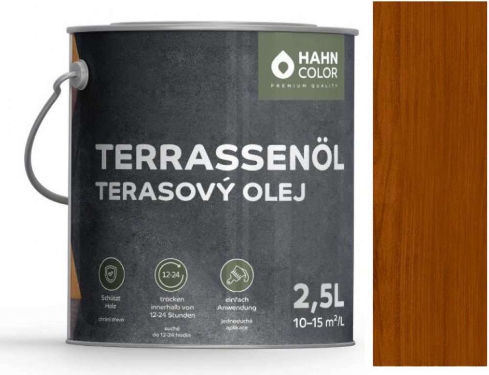 Hahn Color TERASOVÝ OLEJ je revoluční řešení pro ošetření a ochranu vašeho dřevěného exteriéru. Tento vysoce kvalitní olej na bázi modifikovaných alkydových pryskyřic je speciálně navržen pro hlubokou penetraci do dřeva, což zajišťuje maximální ochranu před povětrnostními vlivy, vodou a UV zářením. Ať už jde o zahradní nábytek, nebo dřevěné terasy. Hahn Color Terasový Olej je ideální volbou pro dlouhotrvající a spolehlivou ochranu.