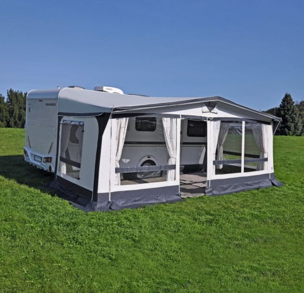 Předstan ke karavanu Meira nabízí dostatek prostoru pro celou rodinu. Tento prostor lze ještě rozšířit o stanovou přístavbu Bay. Díky velkým oknům je uvnitř předstanu dostatek světla. Okna jsou vybavena závěsy s rolovacím závěsem. Stan je vybaven speciálním potrubím pro umístění bezšroubových přídržných konzol (konzoly nejsou součástí balení).Pro větší soukromí stačí jen zatáhnout závěsy, které jsou součástí balení. Stan je opatřen dvojitým kedrem na očka k zavěšení horizontálních stanových tyčí ke karavanu bez nutnosti vrtání do stěny. (popruhy lze dokoupit samostatně).
