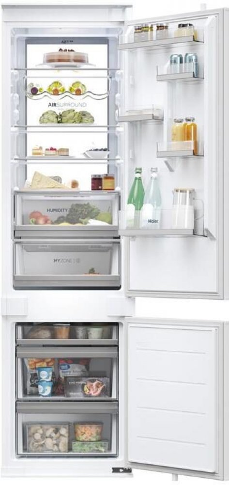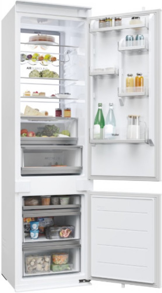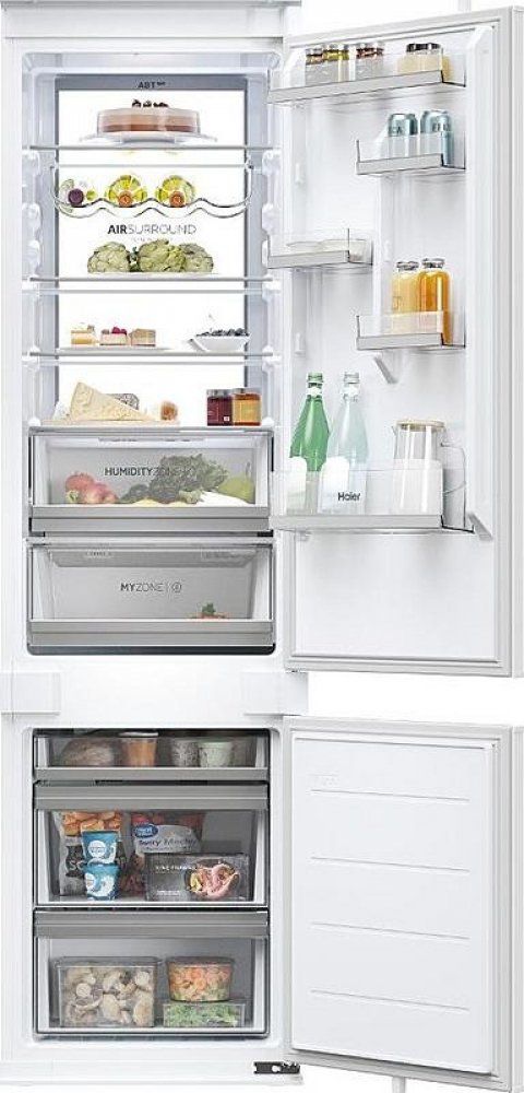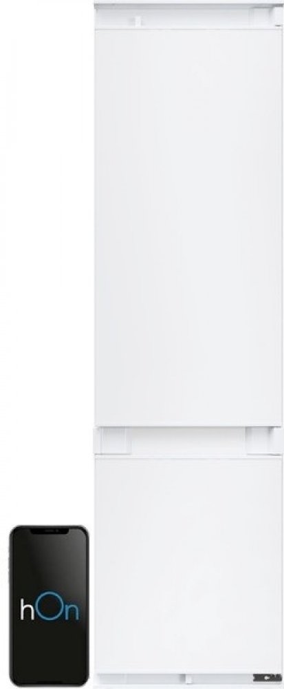 vestavná chladnička s mrazákem • výška 199,3 cm • objem chladničky 214 l / mrazničky 86 l • energetická třída D • 20 let záruka na kompresor • dva chladicí okruhy • Wi-Fi a Bluetooth připojení, aplikace hOn • technologie Total No Frost – rovnoměrné chlazení bez námrazy • funkce Super Cool a Super Freeze • zásuvka Crisper – udržuje vlhkost do 90 % • zásuvka My Zone – individuální nastavení teploty • osvětlení LED Daylight • LED displej • akustický signál dvířek • možnost změny směru otevírání dveří • hlučnost 32 dB • V × Š × H: 199,3 × 54 × 55 cm