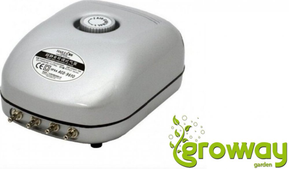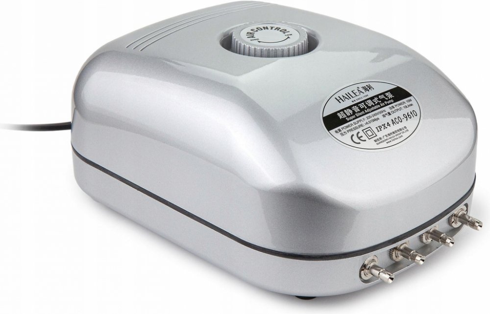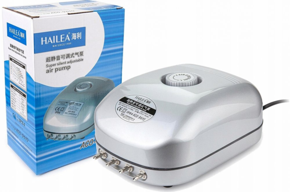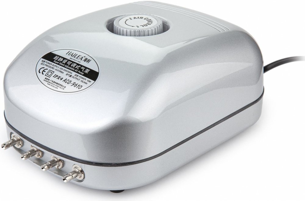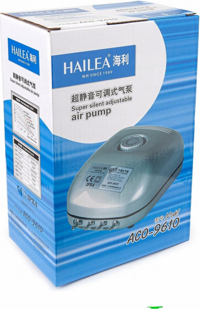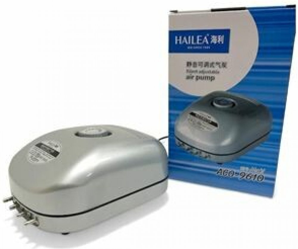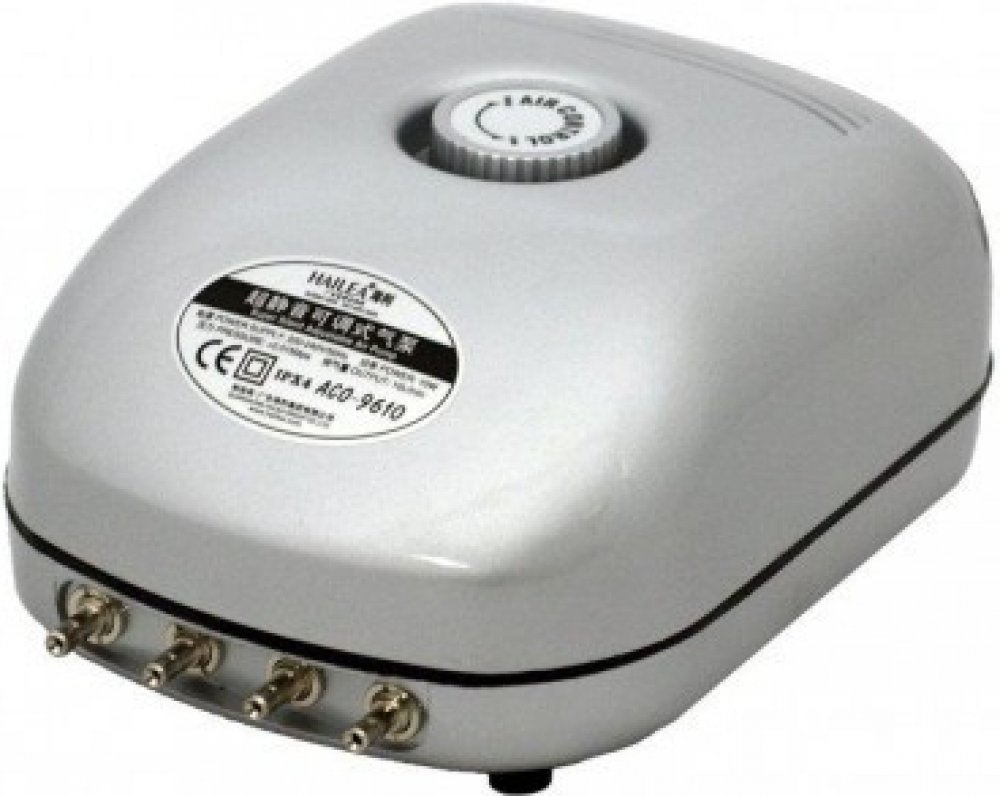 Pumpy Hailea.Sortiment vzduchových čerpadel s nastavitelným výkonem nabízí maximální flexibilitu v rozsahu možností nastavení. Jsou super tichá a mají velice nízkou spotřebu. Výstup na hadičku ke vzduchovacímu kameni je 4* 4 mm.Výkon 600 L/hod.