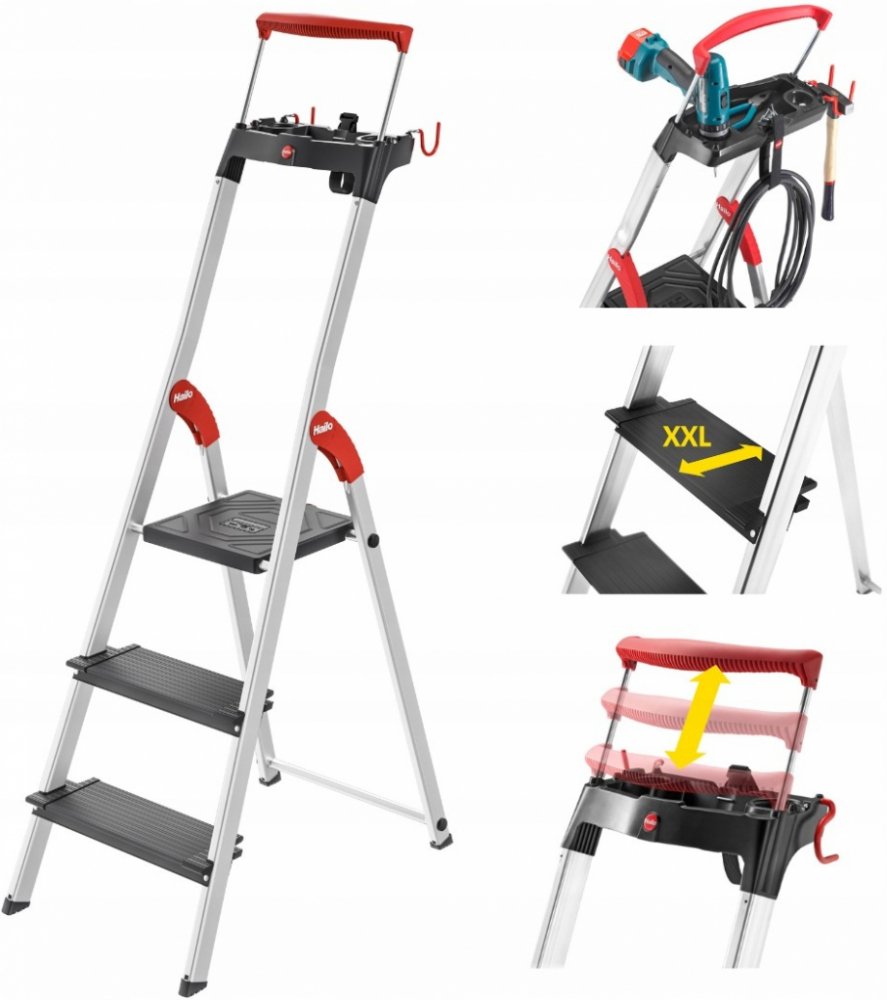 Hliníkové schůdky Hailo L100 TopLine 3-stupňové jsou bezpečné a stabilní schůdky určené pro domácnost i profesionální využití. Nabízí vysoký komfort práce díky extra širokým protiskluzovým stupňům o hloubce 13 cm, které zajišťují pohodlný a pevný nástup.