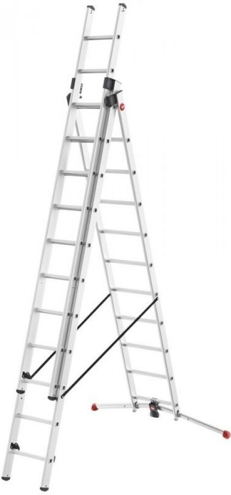 Hliníkový žebřík HAILO 3x11 příček s ocelovou obloukovou patou, jejíž pomocí lze vyrovnat nerovnosti terénu +/- 10 cm. Pohyblivé spojení dolních dílů umožňuje nastavení různých výškových úrovní např. na schodech viz video níže (pouze typy 9306-507 a 9309-507). Typ 1423-805 a 9312-507 schodišťové provedení nemá. Tento žebřík má mimořádně kvalitní provedení, patentované příčně...