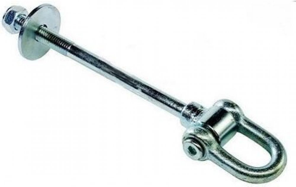 Houpačkový hák se závitem, pro bezpečné zavěšení houpaček. Průměr závitu: M12 Délka závitu: 55 mm Délka tyče: 155 mm Celková délka: 240 mm Vnitřní průměr oka: 22 mm Hmotnost: 394 g Povrch: Bílý zinek