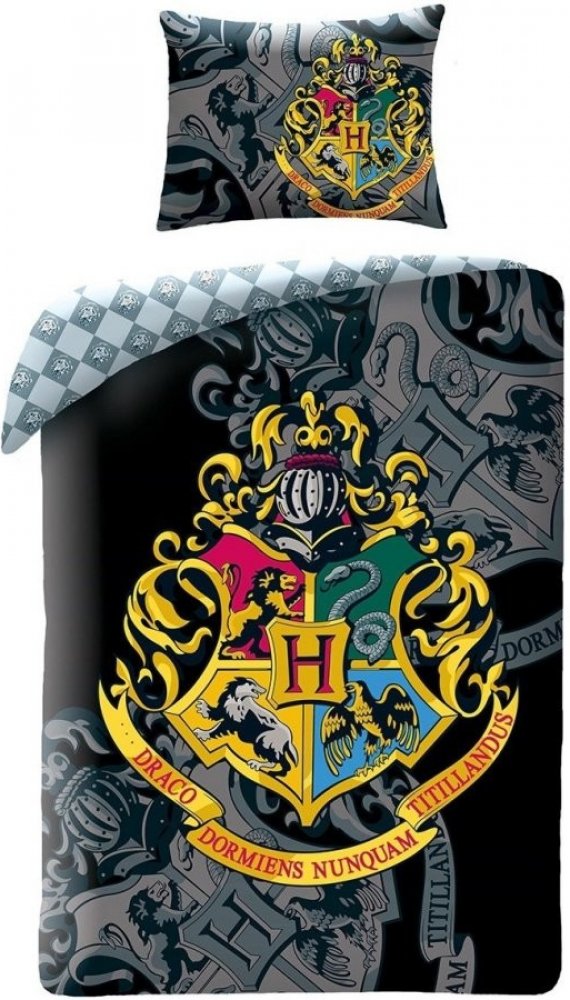 Souprava ložního povlečení Harry Potter - Hogwarts. Je vyrobena ze 100% bavlny se zapínáním na zip. Přední stranu povlečení zdobí erb školy čar a kouzel v Bradavicích na šedém podkladu. Znak čarodějnické školy v Bradavicích se skládá jak jinak než ze znaků čtyř kolejí a to Nebelvíru, Zmijozelu, Mrzimoru a Havraspáru. Na druhé straně povlečení jsou symboly z fantasy příběhů o čaroději Harry Pottero...