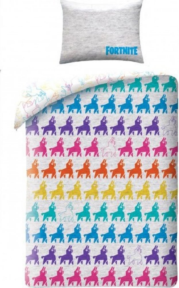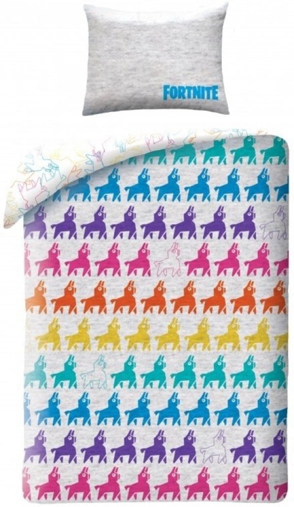 Ložní povlečení FORTNITE. Oboustranné bavlněné povlečení s motivem z počítačové hry FORTNITE - licenční produkt s hologramovým štítkem Epic Games. Je vyrobeno ze 100% bavlny se zapínáním na zip. Na přední straně povlečení jsou geometricky srovnané lamy v duhových barvách na šedém podkladu, zadní strana povlaku přikrývky je potištěna siluetami lam bez ladu a skladu. Povlak polštáře je z obou stran ...