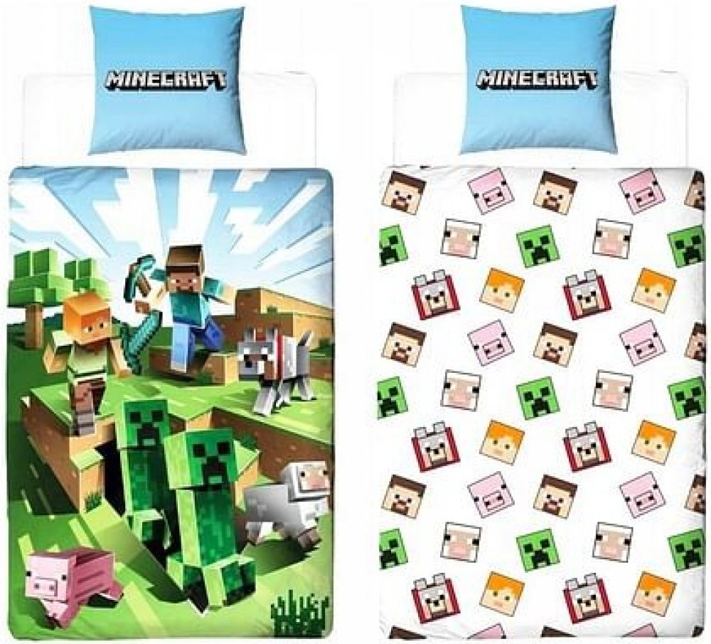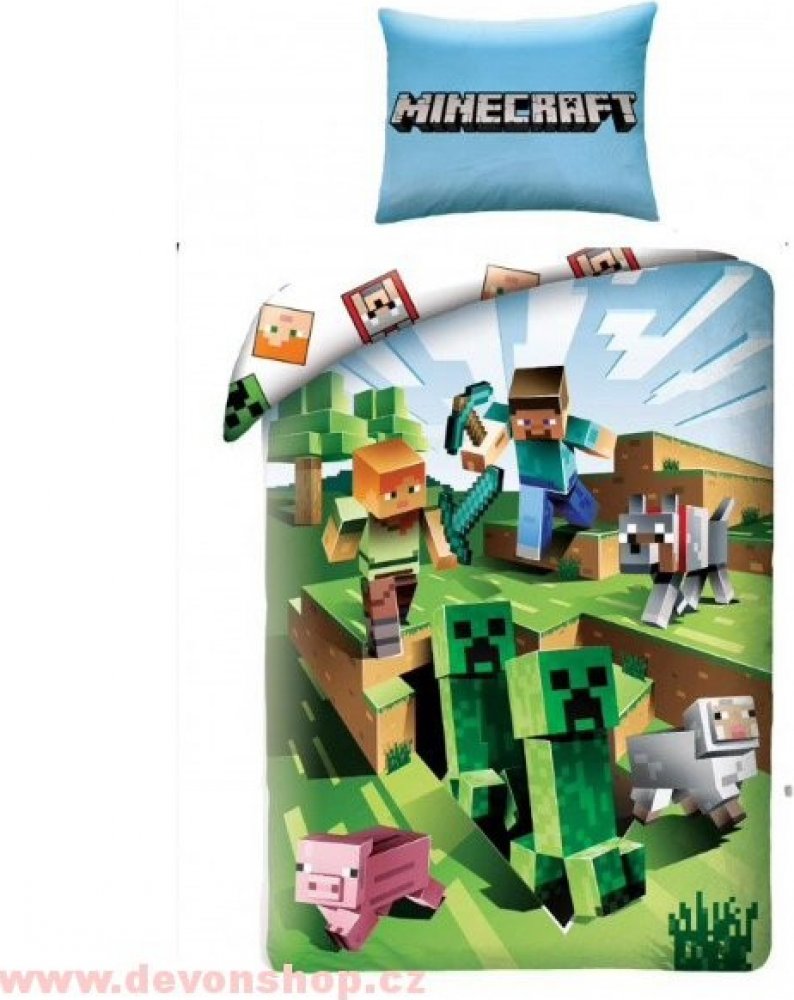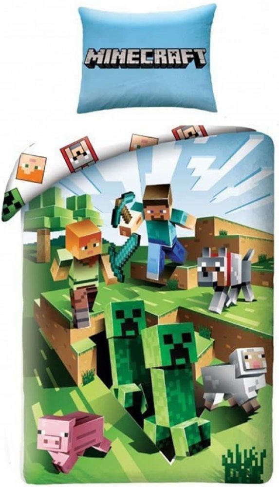 Dětské povlečení na velkou postel zdobí na dece obrázek postaviček Minecraft a nechybí ani Creeper. Ze zadní strany potěší ikonky. Polštář je z každé strany stejný. Pokud k lůžkovinám přidáte malý polštá-řek, bude vzhled postele dokonalý.