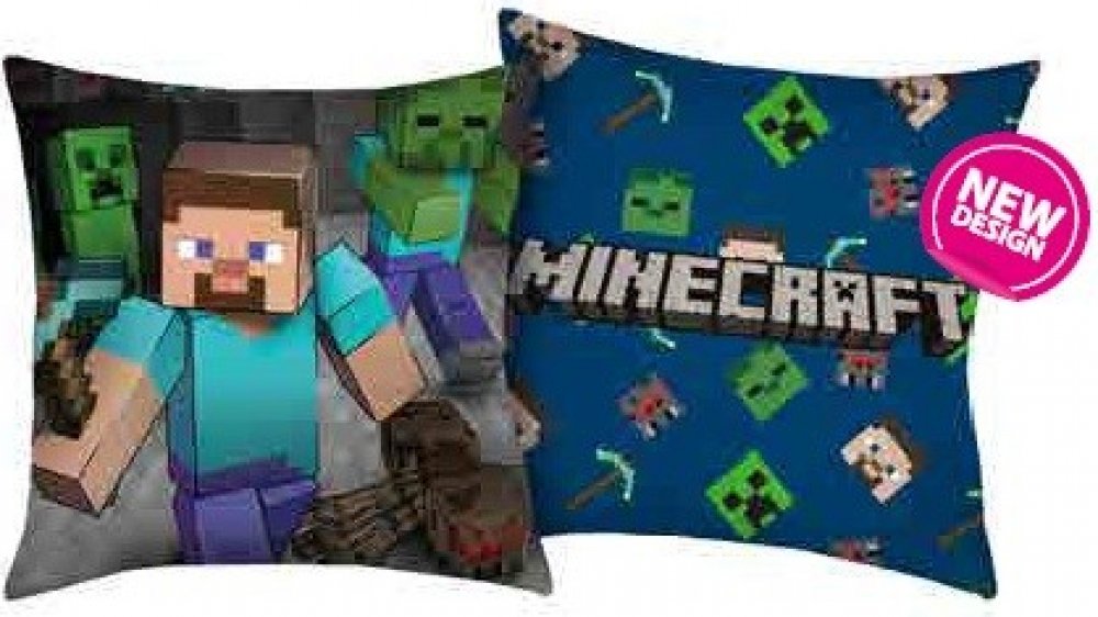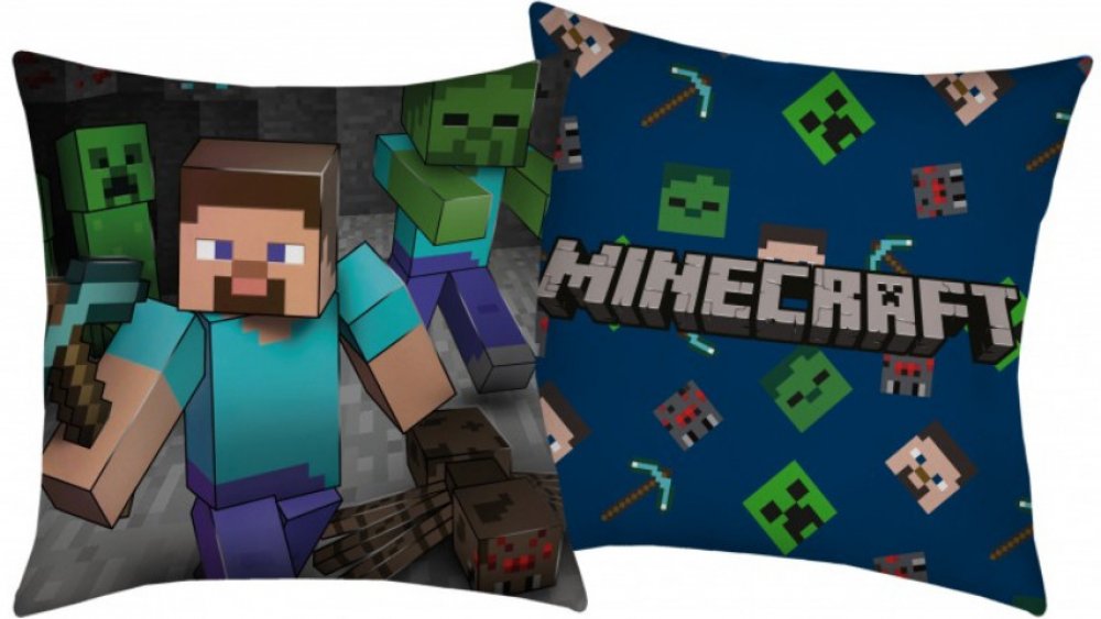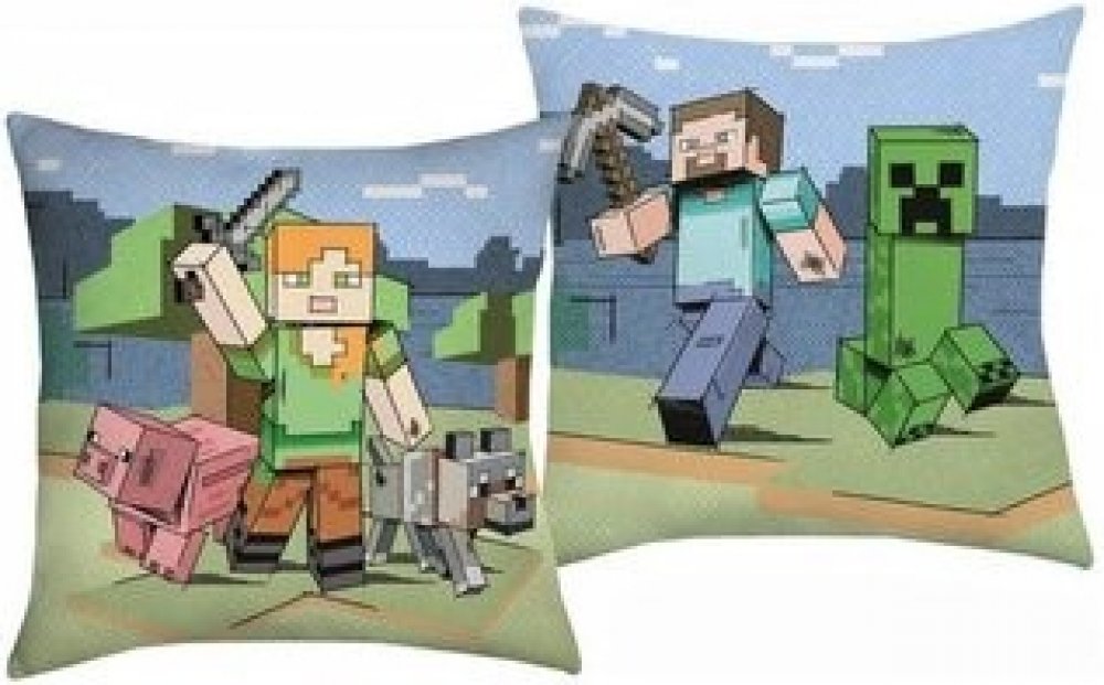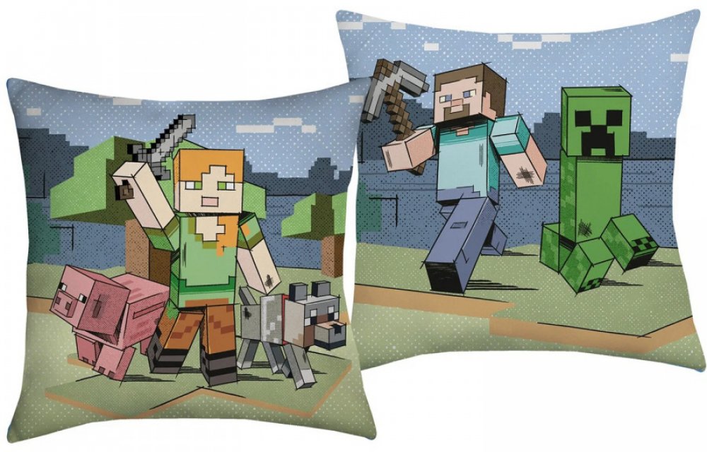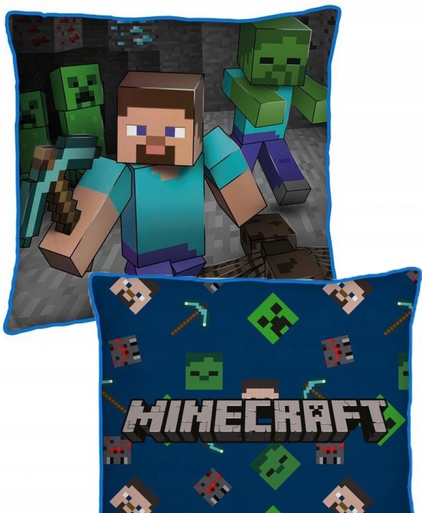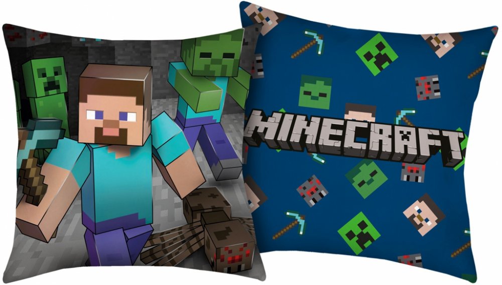 Z každé strany polštářku je jiný motiv PC hry Minecraft - Steve a nápis. Polštářek je laděný do modro šedé barvy. Společně s povlečením vytv...
