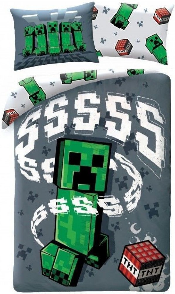 HALANTEX Povlečení Minecraft Creeper Grey Od teď už nebudete muset svého klučinu přemlouvat, aby šel na kutě. Rád se totiž sám zachumlá do peřin Minecraft Creeper. Jak povlečení vypadá Dětské povlečení na velkou postel ohromí obrázkem Creepera a syčícího zvuku. Ze zadní strany můžete vidět podklad, laděný do bílé barvy se vzorem zelené postavičky a dynamitu. Pokud k lůžkovinám přidáte malé polštář...
