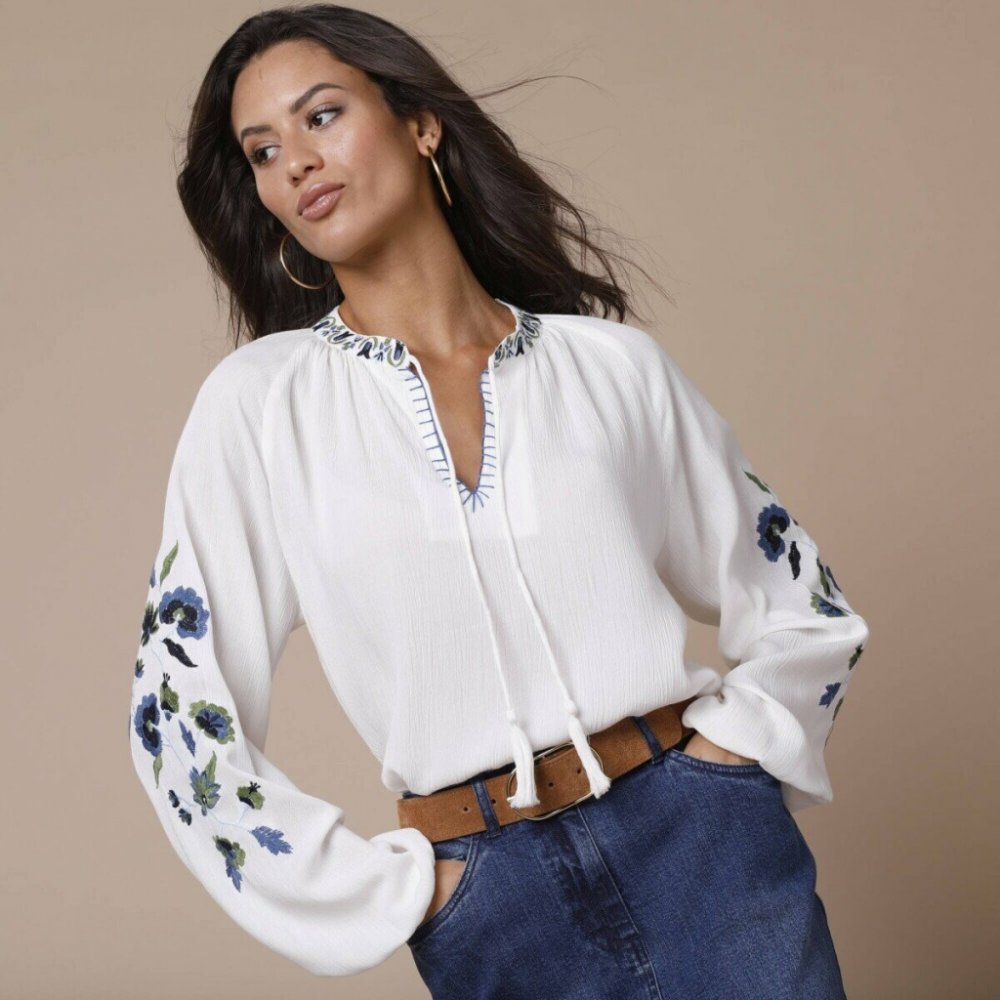 Folková inspirace přináší halenku s výšivkou a kulatým výstřihem. Kulatý výstřih s průstřihem, kontrastním zdobením a šňůrkou se střapci. Nařasení pod výstřihem vpředu a vzadu. Dlouhé široké pružné rukávy. Raglánové průramky. V horní části rukávů středová výšivka. Rovný spodní lem. Tento produkt byl vyroben z viskózy Lenzing™ EcoVero™. Ekologická viskóza je materiál vyrobený z buničiny z udržiteln...