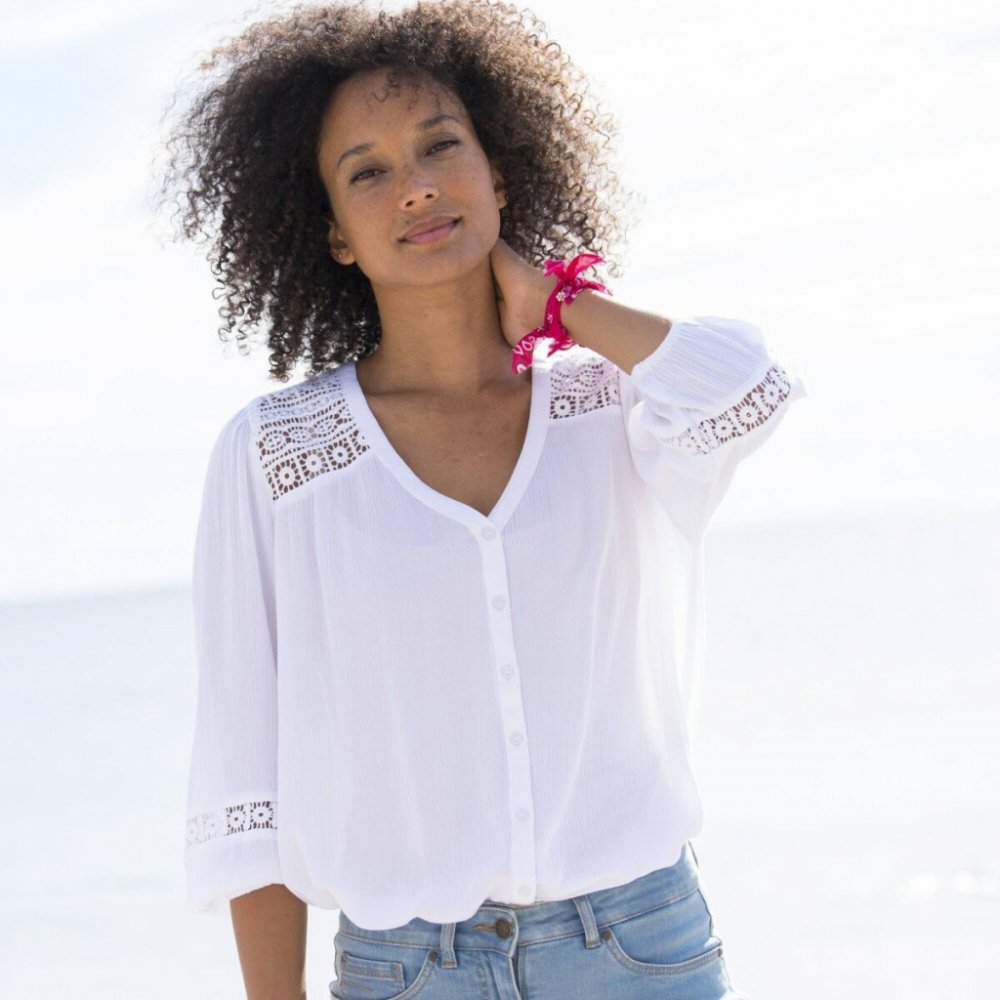Naším oblíbeným kouskem se rychle stala propínací halenka s výstřihem do V. Z lehkého vzdušného úpletu. Ženský výstřih do V. Vpředu celopropínací. Macramé ažurová vsadka v ramenou + nařasení. 3/4 rukávy s macramé pruhem a pružným lemem. Rovný dolní lem. Lze prát v pračce.