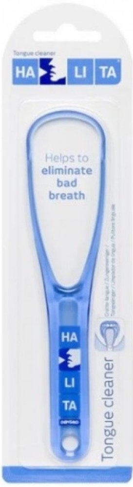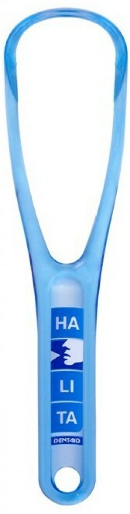HALITA škrabka na jazyk proti zápachu z úst. Škrabka je uprostřed hlavice anatomicky vytvarována tak, aby kopírovala drážku jazyka. Odstranění povlaku je tak mnohem účinnější a tím se více eliminuje nežádoucí zápach z úst. Druhá strana škrabky se používá na čištění okrajových částí jazyka.