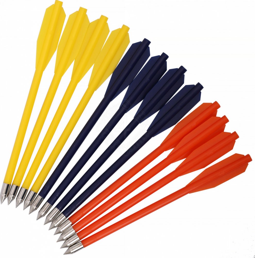 Šípy do kuše z umělé hmoty (12 kusů) Tyto šípy do kuše jsou vhodné k níže uvedeným kuším Hmotnost 12 kusů je cca 80g Délka šípu 16,5cm Pokud bude cíl Vašich střel vyroben z vhodných materiálů, které šíp zastaví, aniž by jej poškodily, bude Vám sloužit dlouhý čas. Zvažte nákup vhodné terčovnice. Dopad šípu na dřevo, kámen či jiné nevhodné materiály, bude mít za následek jeho poškození, které nelze ...