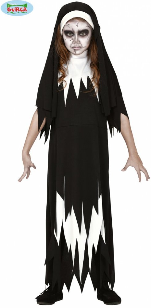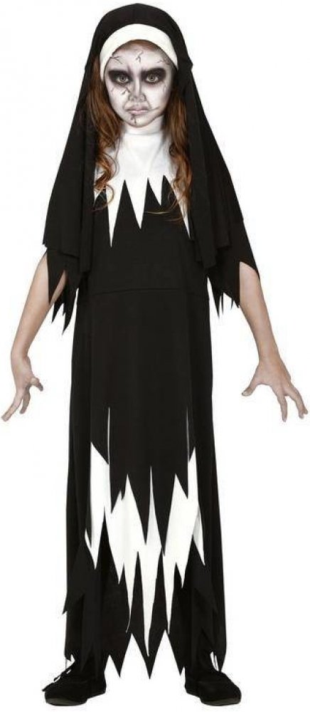 Dětský strašidelný kostým malé jeptišky se skládá z černých dlouhých šatů s bílými prvky.