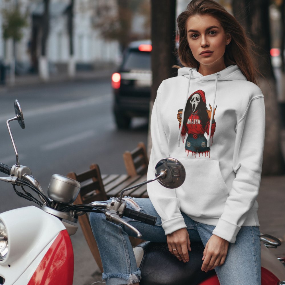 Halloween Máma Vřískot dámská mikina s halloweenským potiskem Bílá