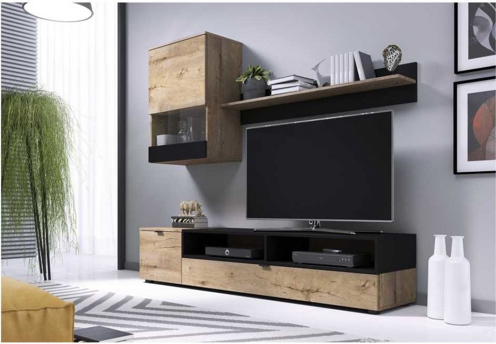 Designová nástěnná skříňka SNAP v rustikálním stylu Dýhovaná nástěnná skříňka SNAP se bude skvěle hodit do malého obývacího pokoje zařízeného v rustikálním stylu. Sestava se skládá z nástěnné skříňky se sklem, skříňky rtv a nástěnné police. Všechny prvky nástěnné skříňky SNAPjsou vyrobeny z dýhované nábytkové desky, která se vyznačuje trvanlivostí a odolností proti poškrábání a nárazům. Nástěnná skříňka má povrchovou úpravu v kombinaci matné černé barvy a barevného provedení dub lefkas, které dokonale imituje strukturu přírodního dřeva.Vlastnosti výrobkupolský výrobekz dýhované nábytkové deskybarva: dub lefkas a matná černáprosklení z průhledného tvrzeného sklaúchytky z polypropylenu v černé barvěplastové nohy v černé barvěpro vlastní montážnabízíme široký sortiment nábytku pro kompletní vybavení bytu Výkon Dýhovaný panel Polypropylen Sklo Vlastnosti Nástěnná jednotka se skládá z podlahové jednotky, nástěnné jednotky, RTV jednotky a nástěnné police Informace o výrobkuŠířka: 175Výška: 180Hloubka: 39Hmotnost: 52Stav výrobku: Vlastní montáž Poznámky Výrobek je určen k montáži svépomocí, všechny potřebné součásti pro montáž a návod jsou součástí dodávky Obývací stěna AiseZařizujete obývák nebo kancelář a nechce se vám dlouze vybírat skříňky a police, které k sobě budou ladit? Pak zvažte kompletní sestavu – obývací stěna Aise vám zajistí spoustu úložného prostoru v jednotném designu.Sestava je vyrobena z laminované dřevotřísky a polypropylenu ve vkusné barevné kombinaci. Rozmístění jednotlivých prvků už je jen na vás.TV stolekDominantou celé sestavy je TV stolek s rozměry 175 × 39 × 34 cm (šířka × hloubka × výška). Nabídne vám 2 prostorné police a 2 skříňky s křídlovými dveřmi.Závěsná skříňkaSkříňka je veliká 55 × 31 × 77 cm a chlubí se 2 oddíly se společnými dvířky. Ta jsou ve spodní části prosklená, takže zde můžete vystavit třeba sváteční servis nebo trofeje.PoliceSestavu doplňuje jednoduchá police na knihy či dekorativní předměty. Zajistí vám 120 × 20 cm odkládacího prostoru.Užijte si moderní design