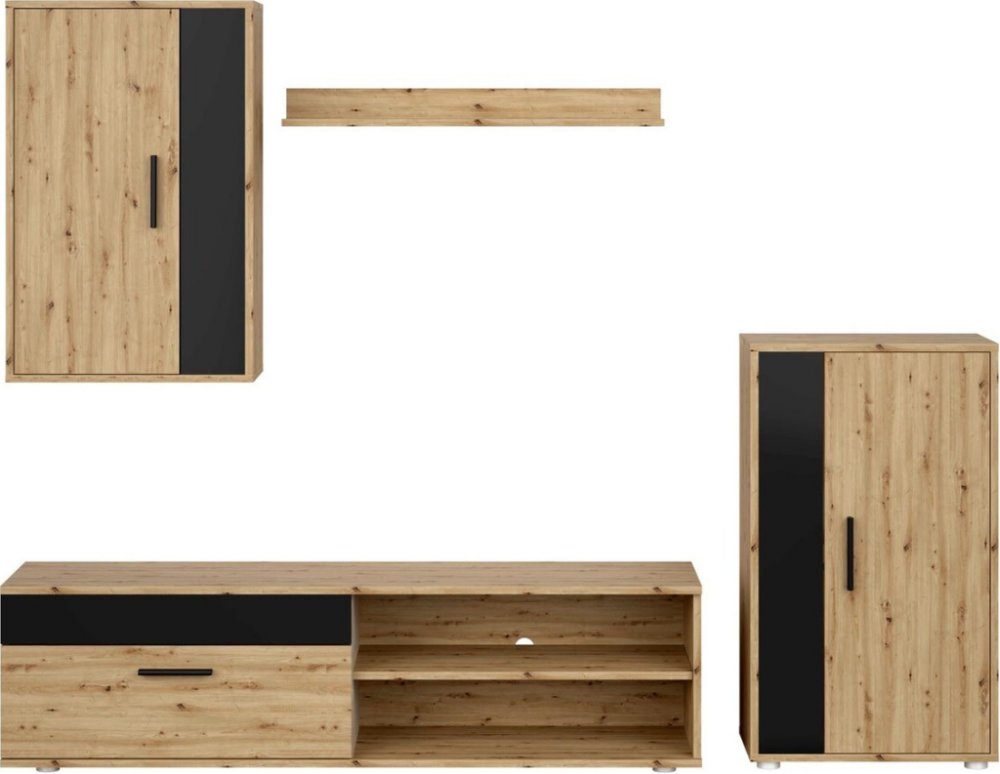 Stylový a promyšlený nábytkový set Benson přináší do obývacího pokoje nebo moderního interiéru kombinaci teplého dekoru dąb artisan a elegantních černých akcentů. Tento set je navržen s důrazem na funkčnost i estetiku — jeho provedení poskytuje dostatek úložného prostoru a působí vizuálně lehce i v menších prostorech.