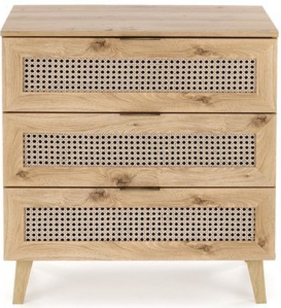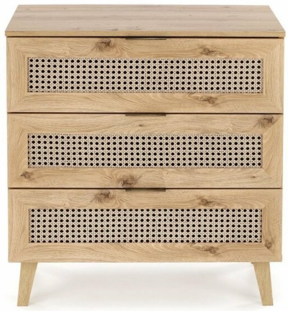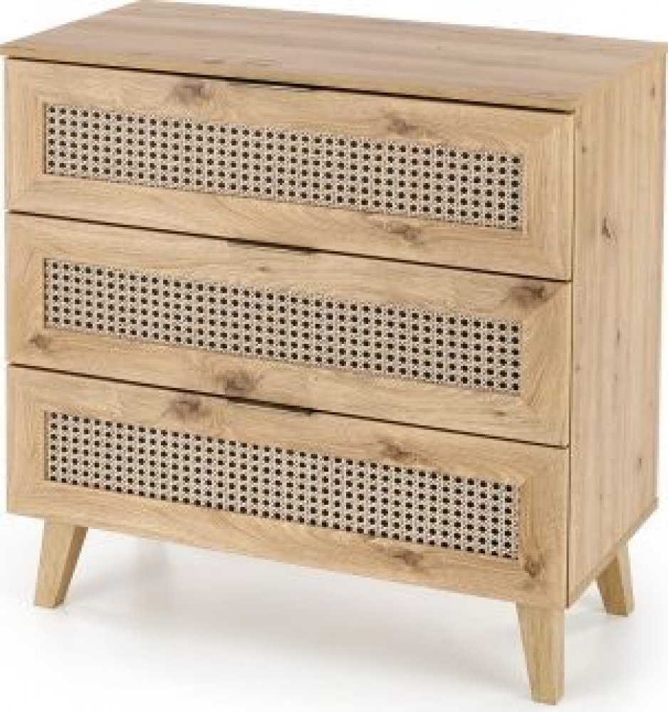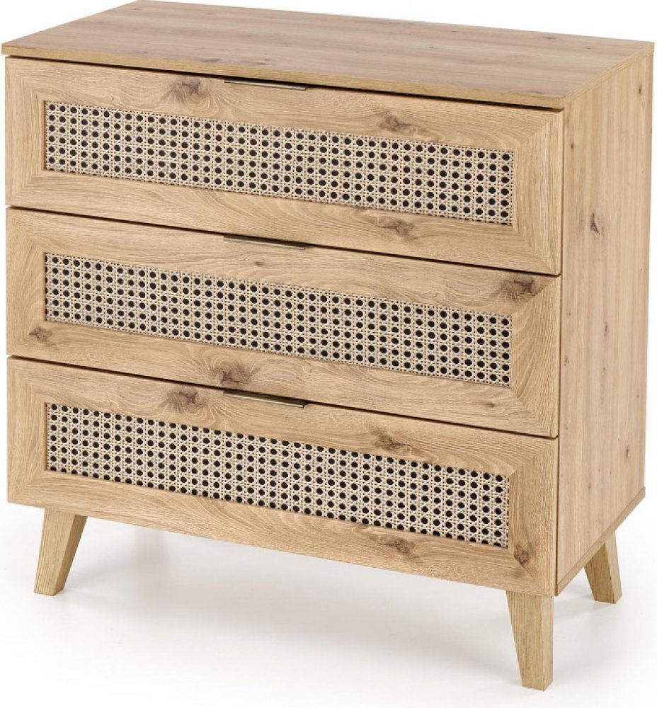 Díky dekoru dubu artisan a módním vložkám se vzorem vídeňského copu získává komoda jedinečný boho styl, který zaujme na první pohled. Tři prostorné šuplíky vám nabídnou dostatek místa pro přehledné uložení oblečení, dokumentů či dekorací, zatímco kompaktní rozměry zaručují, že komoda snadno najde své místo i v menších prostorech.