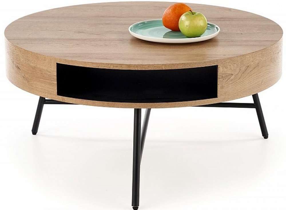 Konferenční stolek Camila vám umožní krásně vylepšit estetické aranžmá v obývacím pokoji, salonku a dokonce i jídelně. Kulatý konferenční stolek s průměrem 80 cm je vyroben z kvalitní dýhované MDF desky v dekoru zlatý dub, na které je viditelná kresba dřeva. Originálním prvkem tohoto modelu je polička mezi horní a spodní částí hlavní stolové desky — do ní je možné uložit drobné příslušenství v podobě novin nebo dálkového ovladače TV. Moderní konferenční stolek v barvě dřeva je umístěn na tvarově upravených nohách z práškově lakované oceli v černé barvě. Prezentovaný produkt jistě osloví lidi, kteří ocení jedinečnost nábytku v kombinaci s jeho funkčností. Nosnost 30 kg.