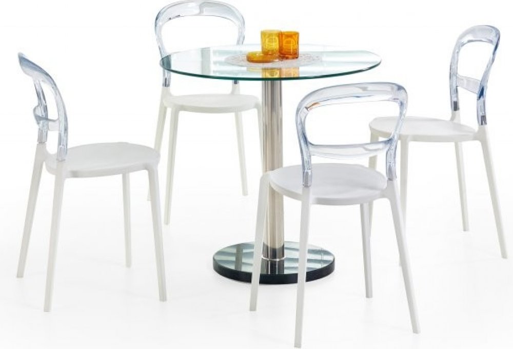 Jídelní stůl Cyryl vyniká svým moderním kulatým tvarem. Tento jídelní stůl je vhodný do malých světlých místností. Představuje svěžest a vizuálně rozjasní pokoj. Stůl je vyrobený kombinací několika velmi kvalitních a odolných materiálů. Deska z čirého tvrzeného skla je připevněna na podnož z chromované oceli. Vše je podepřeno kulatou podstavou z mramoru.