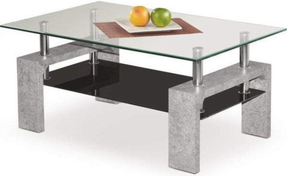 Skleněný konferenční stolek DIANA INTRO se skládá ze dvou odkládacích polic z čirého a černého skla. Jeho stylový vzhled se hodí do moderního obývacího pokoje. Nohy stolu jsou vyrobeny z laminované MDF v betonovém provedení. Pokud se vám nelíbí tato barva, je k dispozici i v jiných barvách. Rozměry stolu jsou (šxhxv): 100x60x45 cm.