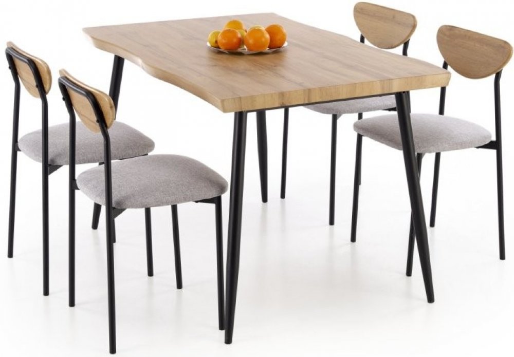 Sestava Dicky obsahuje jídelní stůl a čtyři židle ve stylu tradičního moderního provedení. Stůl má laminovanou desku v přírodním dekoru a stabilní kovovou konstrukci v černé barvě. Židle jsou čalouněné popelavou tkaninou a mají kovové nohy pro pevnost a dlouhou životnost. Celý set je ideální pro jídelny a kuchyně a pohodlně usadí až 6 osob.