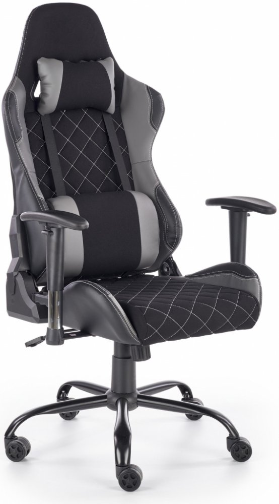 Herní židle Drake je potažená kombinací černé a šedé eko kůže a černé prošívané látky.