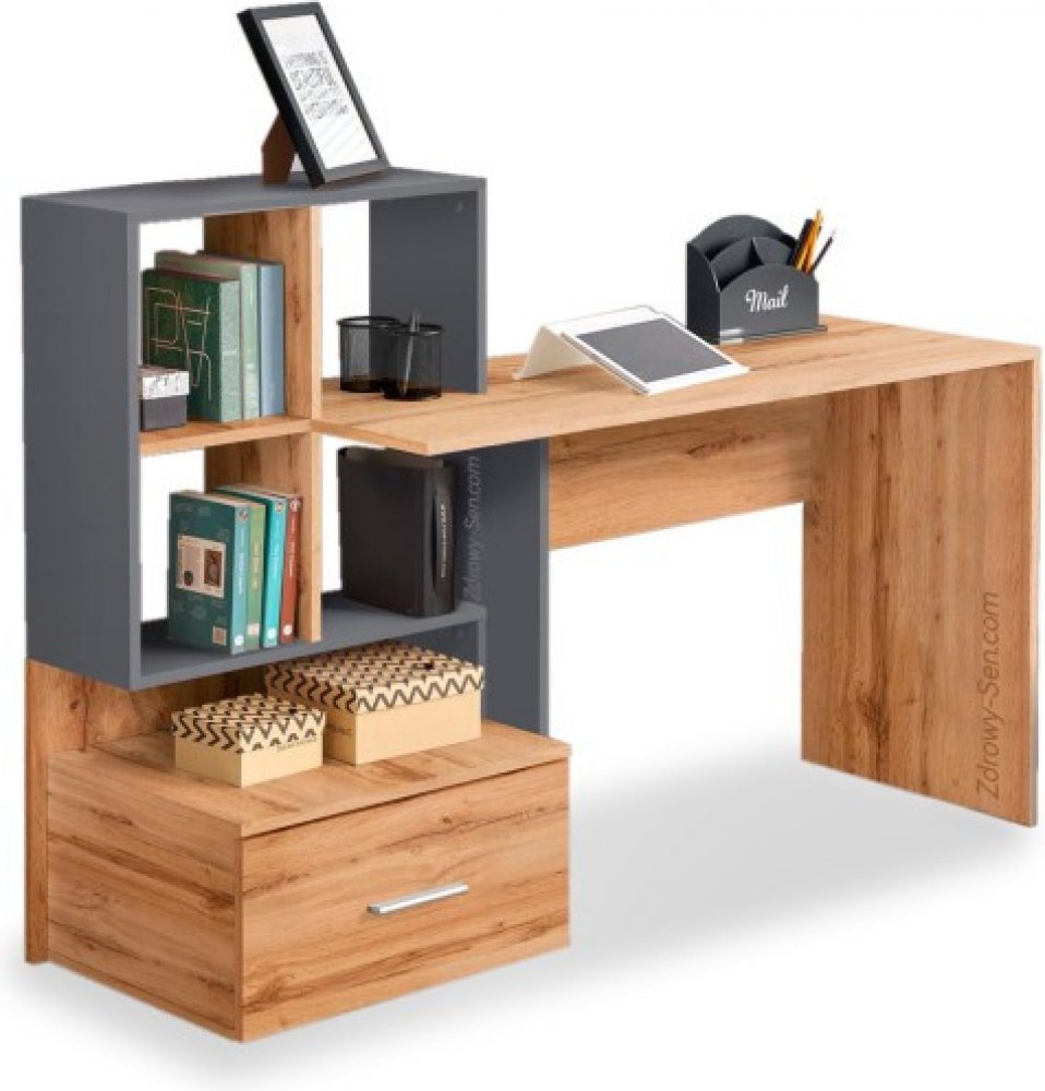 Stůl Grosso je ideální do dětských pokojů nebo mládežnických pokojů. Model se vyznačuje vysokou kvalitou provedení a atraktivním a zajímavým tvarem, který přitahuje pozornost. Vkusná barevná kombinace dubu wotan s antracitovou barvou potěší zejmna osoby, kter hledají originální nabídky.