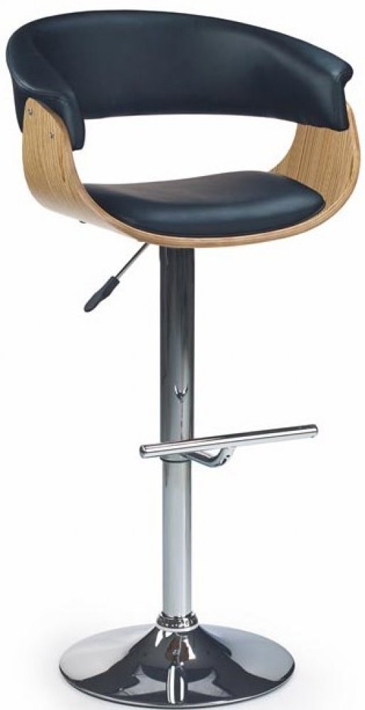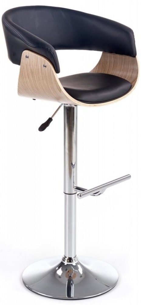 Velmi moderní funkční barová židle H-45 Vás již na první pohled utvrdí o svém pohodlí. Pohodlnost, židle poskytuje opěrákem zad, který je prodloužen a slouží i jako opěrka rukou. Prodloužený opěrák je celkově čalouněný, a to černou eko kůží. Tímto potahem je čalouněn také sedák, vše je zasazeno do skořápky, která je vyrobena z ohýbané překližky v barvě světlý dub.