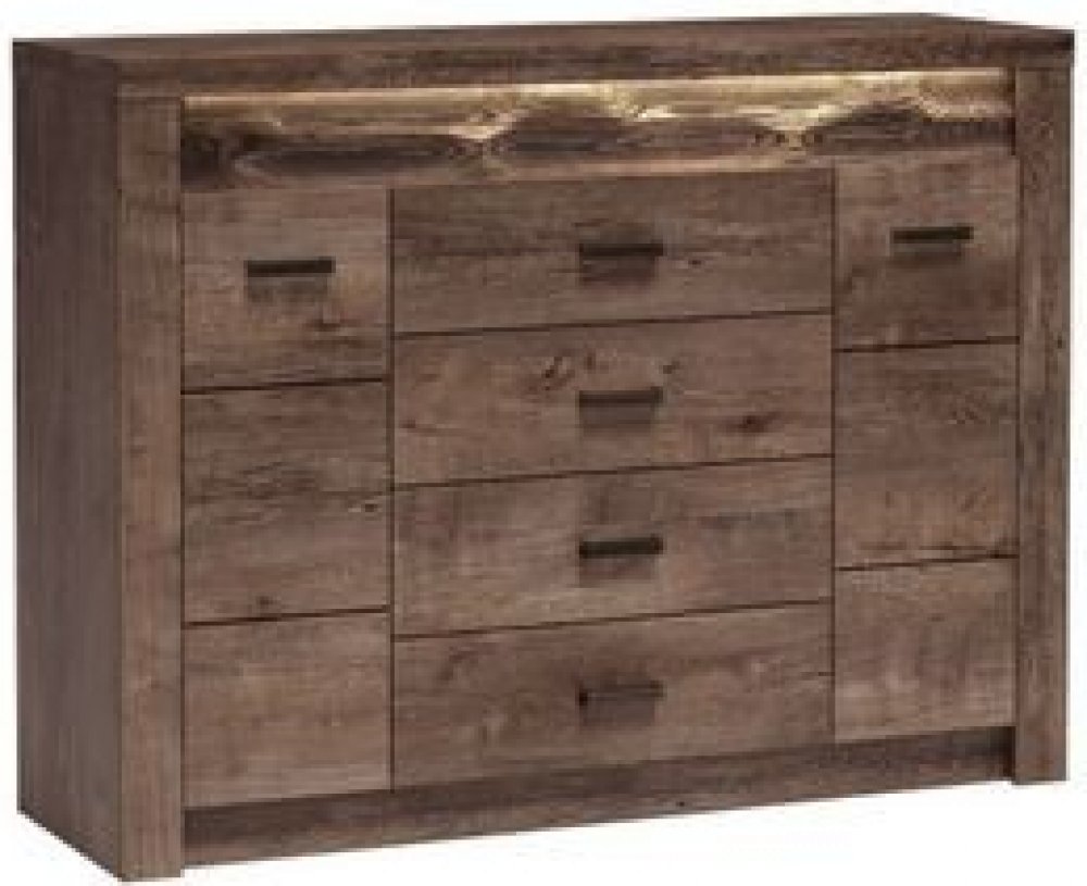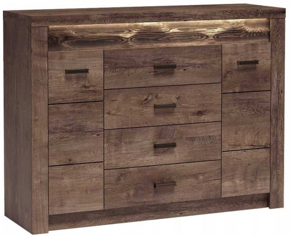 Komoda je vybavena čtyřmi prostornými zásuvkami a dvěmi skříňkami s policemi, což z ní činí ideální úložný prostor pro vaše oblečení, dokumenty či dekorace. Robustní horní deska je perfektním místem pro umístění stylových doplňků, díky kterým váš prostor získá osobitý charakter.