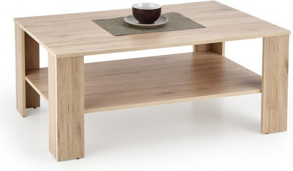 Konferenční stolek KWADRO je vyroben z laminované MDF desky. Deska stolu z laminované MDF desky je odolná vůči vysokým teplotám, poškrábání a oděru a snadno se udržuje v čistotě. Prezentovaný konferenční stolek do obývacího pokoje má praktickou polici, na kterou můžeme umístit již čtenou knihu, televizní program nebo TV ovladač, což pomáhá udržovat pořádek.