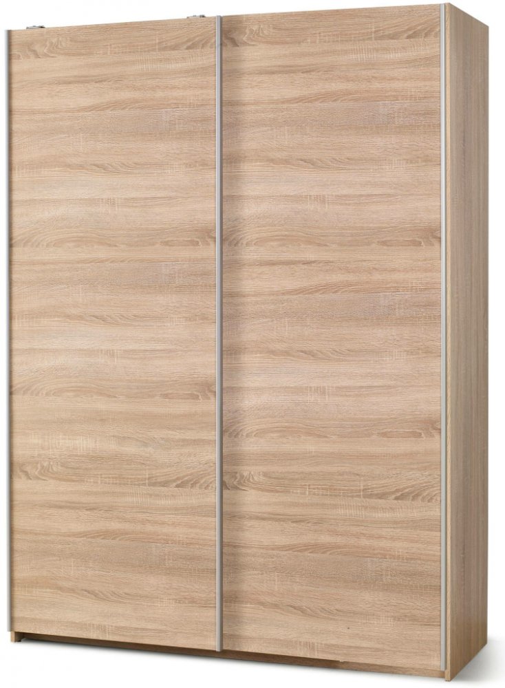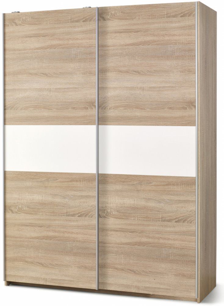 Šatní skříň Lima I Šatní skříň Lima I Široká šatní skříň Lima I je součástí celé nábytkové řady Lima. Skvěle se bude vyjímat zejména v ložnici či šatně. Zásluhou decentního designového provedení zútulní jakýkoliv interiér. Konstrukce šatní skříně je vyrobená z laminovaných desek ve vysokém lesku s ABS hranou. Dodáváme ji ve 3 barevných provedeních - v bílé, dubu sonoma a v kombinaci bílé s dubem sonoma. Korpus skříně se dělí na 2 posuvná křídla. V pravém křídlu se nachází vysoký oddíl s držákem na ramínka na šaty a policový oddíl. Levé křídlo se dělí na 4 úložné prostory oddělené policemi. Pod těmito policemi se navíc nachází 2 šuplíky.