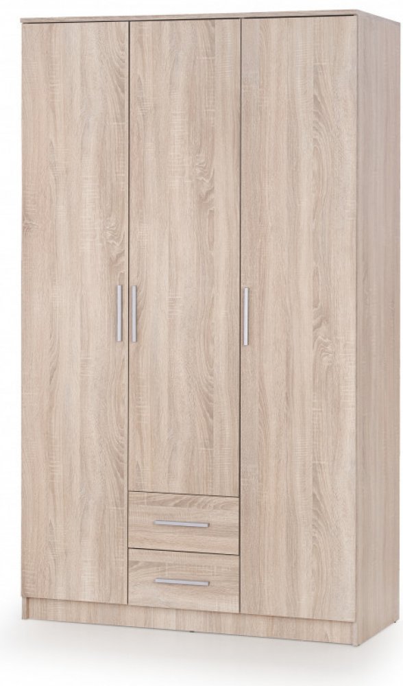 Šatní skříň Lima III Šatní skříň Lima III Široká šatní skříň Lima III je součástí celé nábytkové řady Lima. Skvěle se bude vyjímat zejména v ložnici či šatně. Zásluhou decentního designového provedení zútulní jakýkoliv interiér. Konstrukce šatní skříně je vyrobená z laminovaných desek ve vysokém lesku s ABS hranou. Dodáváme ji ve 3 barevných provedeních - v bílé, dubu sonoma a v kombinaci bílé s dubem sonoma. Korpus skříně se dělí na 3 oddíly. V levém bočním křídlu se nachází vysoký oddíl s držákem na ramínka na šaty a policový oddíl. Prostřední část skříně je pokračováním oddílu na šaty. Zahrnuje navíc 2 šuplíky. Pravé boční křídlo se dělí na 5 úložných prostorů oddělených policemi.
