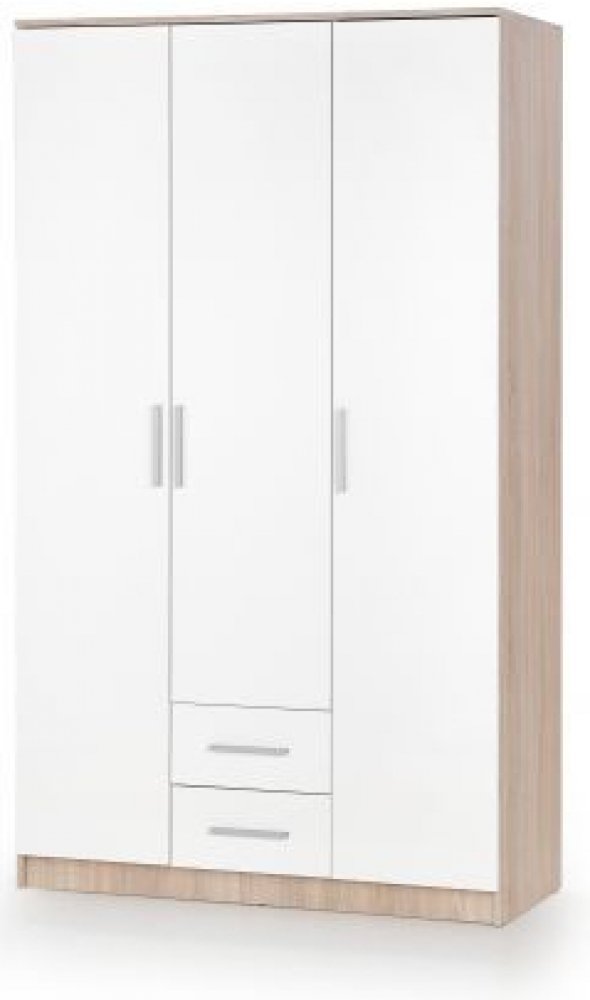Elegantní skříň se dvěma praktickými šuplíky a třemi dvířky, za prvními a druhými dvířky se nachází polička a prostor s tyčí na uložení ramínek s oblečením a za třetími dvířky se nachází 5 poliček, rozměry: 120/52/205 cm, materiál: laminovaná dřevotříska, hrany ABS, barva: bílá