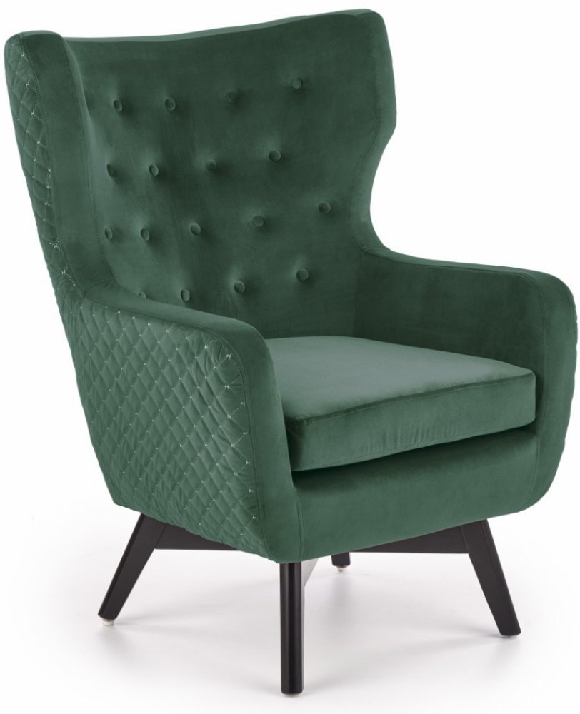 Tmavě zelené křeslo Marvel je ozdobně prošívaný kus nábytek, který dodá interiéru obývacího pokoje elegantní charakter. Křeslo / ušák je masivní kus nábytku s decentně zaoblenými hranami, jehož sedák je vyplněn měkkým polštářem odpovídající pružnosti a měkkosti. V prezentovaném křesle se uživatel bude moci pohodlně opřít a položit ruce na praktické područky. MARVEL stojí na nízké základně tvořené čtyřmi nohami z masivního dřeva namořeného na černo. Esteticky zpracované křeslo je čalouněno sametovou látkou, která je snadno čistitelným materiálem, vypadá efektně a je příjemná na dotek. Moderní křeslo se bude skvěle hodit do odpočinkové zóny v obývacím pokoji, do čtecího koutku, ale i do kancelářských prostor. Nábytek je určen pro svépomocnou montáž.